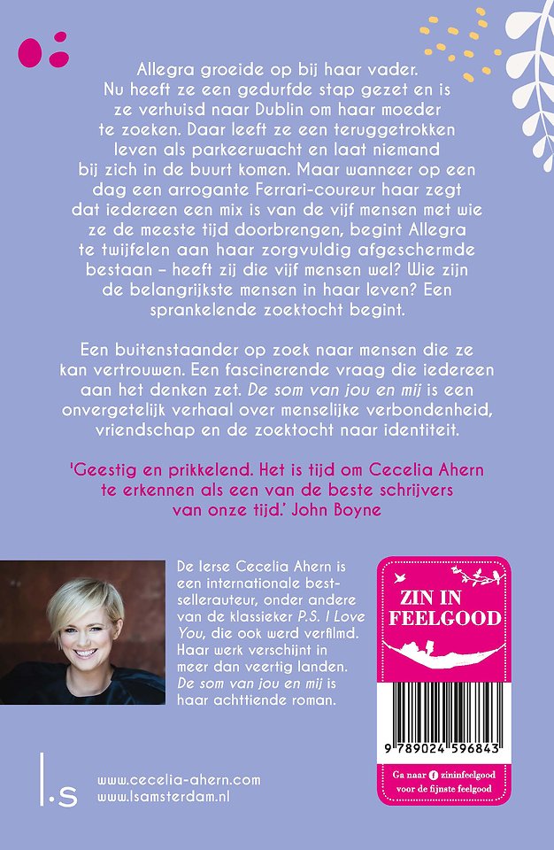 In De som van jou en mij heeft Allegra een gedurfde stap gezet: ze heeft haar excentrieke vader achtergelaten op het eiland waar ze is opgegroeid en ze is verhuisd naar Dublin om haar moeder te zoeken. Ze werkt als parkeerwacht en vervult nauwgezet haar rondes. Allegra leeft teruggetrokken en laat niemand bij haar in de buurt komen. Totdat een arrogante Ferrari-coureur haar op een dag een vraag stelt die haar leven overhoopgooit. In verwarring begint Allegra zich af te vragen: wie zijn de vijf belangrijkste mensen in mijn leven? Een opwindende zoektocht naar betekenis begint.