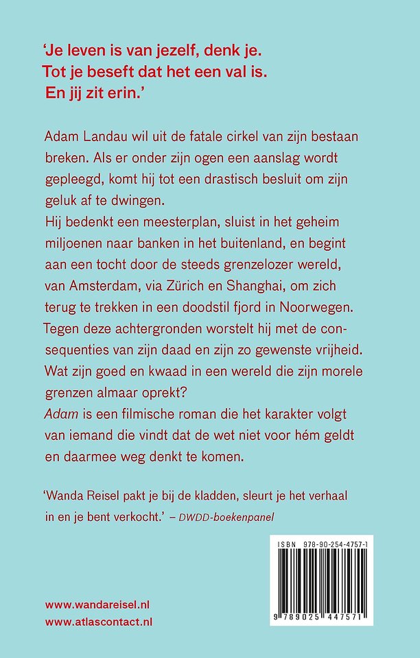 Adam van Wanda Reisel is een filmische roman die het karakter volgt van iemand die vindt dat de wet niet voor hém geldt en daarmee weg denkt te komen.