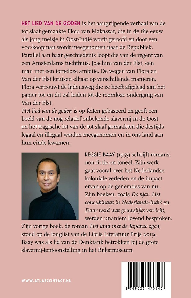 ‘Het lied van de goden’ van Reggie Baay is het aangrijpende verhaal van de tot slaaf gemaakte Flora van Makassar, die in de 18e eeuw als jong meisje in Oost-Indië wordt geroofd en door een VOC-koopman wordt meegenomen naar de Republiek. Parallel aan haar geschiedenis loopt die van de regent van een Amsterdams tuchthuis, Joachim van der Elst, een man met een tomeloze ambitie. De wegen van Flora en Van der Elst kruisen elkaar op verschillende manieren. Flora vertrouwt de lijdensweg die ze heeft afgelegd aan het papier toe en dit zal leiden tot de roemloze ondergang van Van der Elst.