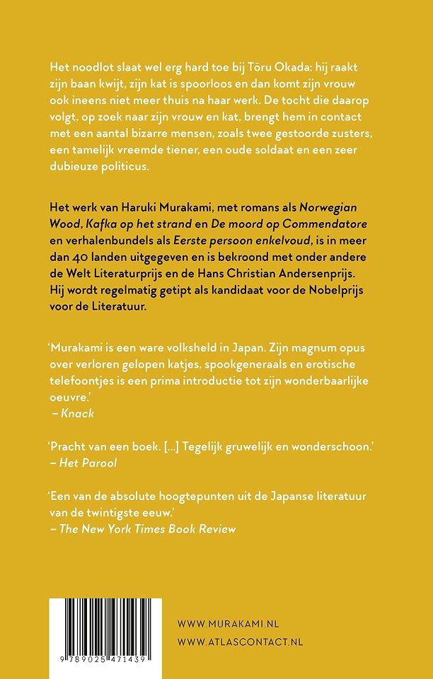 In ‘De opwindvogelkronieken’ van Haruki Murakami slaat het noodlot wel erg hard toe bij Toru Okada: hij raakt zijn baan kwijt, zijn kat is spoorloos en dan komt zijn vrouw ook ineens niet meer thuis na haar werk. De tocht die daarop volgt, op zoek naar zijn vrouw en kat, brengt hem in contact met een aantal bizarre mensen, zoals twee gestoorde zusters, een tamelijk vreemde tiener, een oude soldaat en een zeer dubieuze politicus.