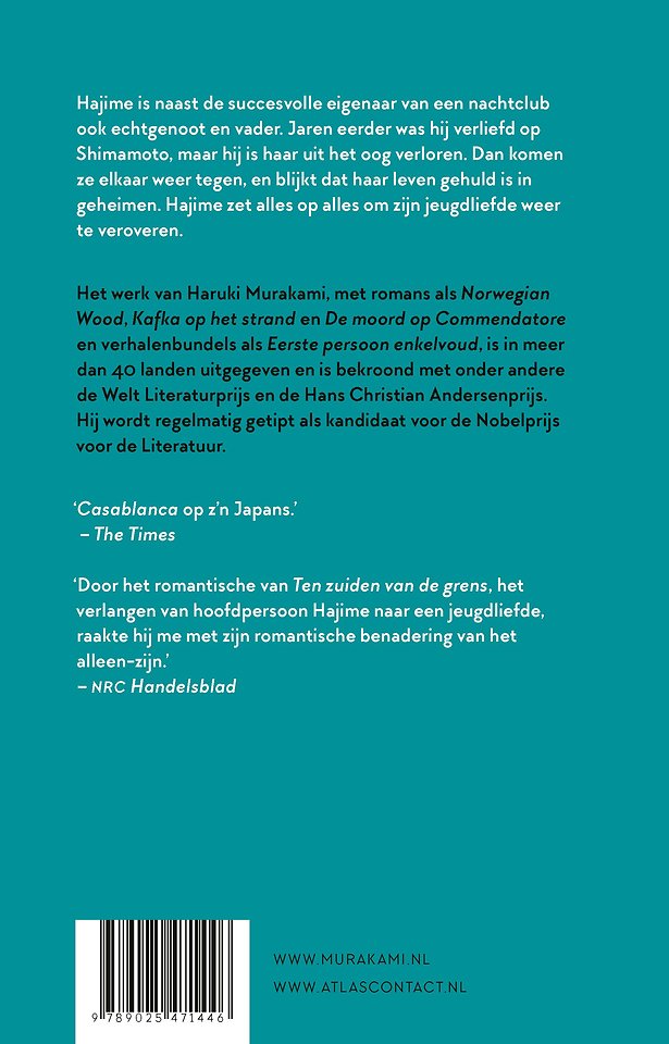 ‘Ten zuiden van de grens’ van Haruki Murakami gaat over Hajime, die naast de succesvolle eigenaar van een nachtclub ook echtgenoot en vader is. Jaren eerder was hij verliefd op Shimamoto, maar hij is haar uit het oog verloren. Dan komen ze elkaar weer tegen, en blijkt dat haar leven gehuld is in geheimen. Hajime zet alles op alles om zijn jeugdliefde weer te veroveren.