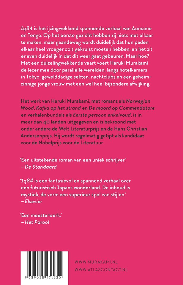 1q84 (spreek uit: qutienvierentachtig) is het ijzingwekkend spannende verhaal over Aomame en Tengo. Aomame is sportschoolinstructrice, maar pleegt daarnaast moorden in opdracht. Tengo is wiskundeonderwijzer en de heimelijke ghostwriter van een bestsellerauteur. Zij hebben op het eerste gezicht niets met elkaar te maken, maar gaandeweg wordt duidelijk dat hun paden elkaar heel vroeger ooit gekruist moeten hebben, en het ziet ernaar uit dat dit weer gaat gebeuren. Aomame raakt verzeild in een parallelle wereld, die ze 1q84 noemt. De q staat voor question mark vraagteken. Met een huiveringwekkende vaart voert Haruki Murakami de lezer mee langs Tokyose hotelkamers, gewelddadige sekten, nachtclubs en een geheimzinnige jonge vrouw, met een wel heel bijzondere afwijking.
