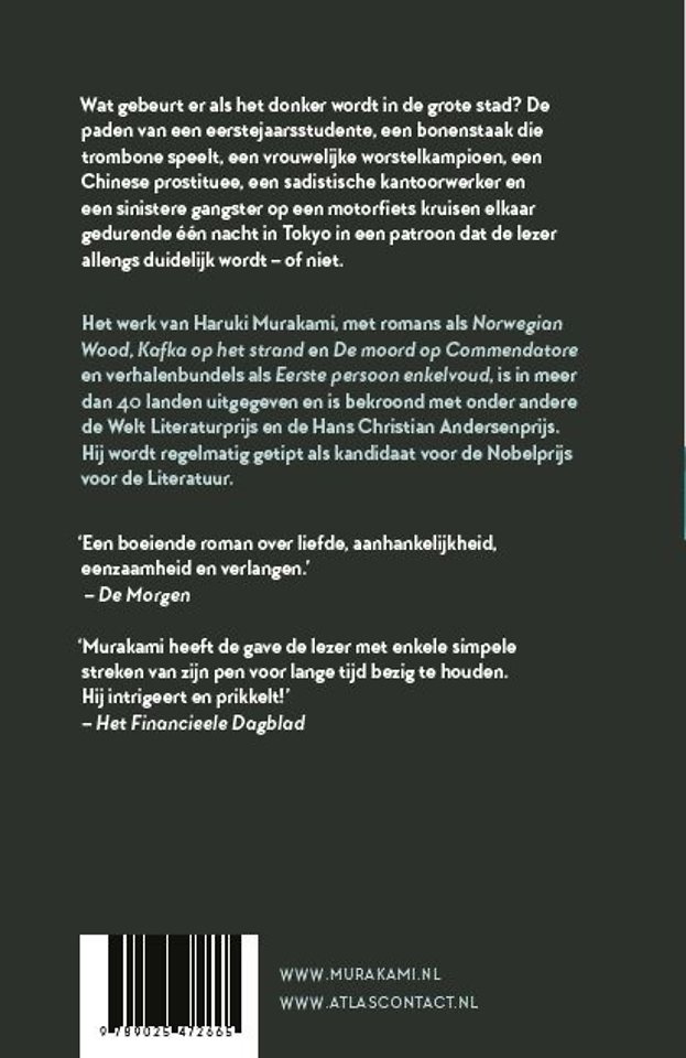 In ‘After Dark’ van Haruki Murakami wordt de vraag gesteld wat er gebeurt als het donker wordt in de grote stad. De paden van een eerstejaarsstudente, een bonenstaak die trombone speelt, een vrouwelijke worstelkampioen, een Chinese prostituee, een sadistische kantoorwerker en een sinistere gangster op een motorfiets kruisen elkaar gedurende één nacht in Tokyo in een patroon dat de lezer allengs duidelijk wordt – of niet.