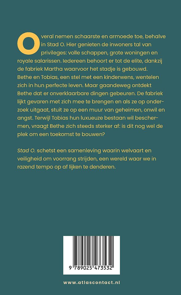 In 2035 verkeert de wereld in crisis. Schaarste en armoede domineren, behalve in Stad O., waar de inwoners genieten van luxe: volle schappen, riante woningen en royale salarissen dankzij de fabriek Martha. Bethe en Tobias, een welgesteld koppel met een kinderwens, lijken het perfecte leven te leiden. Maar gaandeweg komt Bethe erachter dat er onverklaarbare dingen gebeuren. De fabriek lijkt gevaren met zich mee te brengen, en als ze op onderzoek uit wil ondervindt ze tegenwerking van het stadsbestuur. Terwijl Tobias berust in de situatie, vraagt Bethe zich af: wil ze nog wel een toekomst bouwen in een stad vol geheimen en gevaar? In een even verrassende als verontrustende opvolger van zijn succesvolle en bekroonde debuutroman Stenen eten schetst Koen Caris een samenleving waarin welvaart en veiligheid om voorrang strijden. Een wereld waar we in angstvallig hoog tempo op af lijken te denderen.