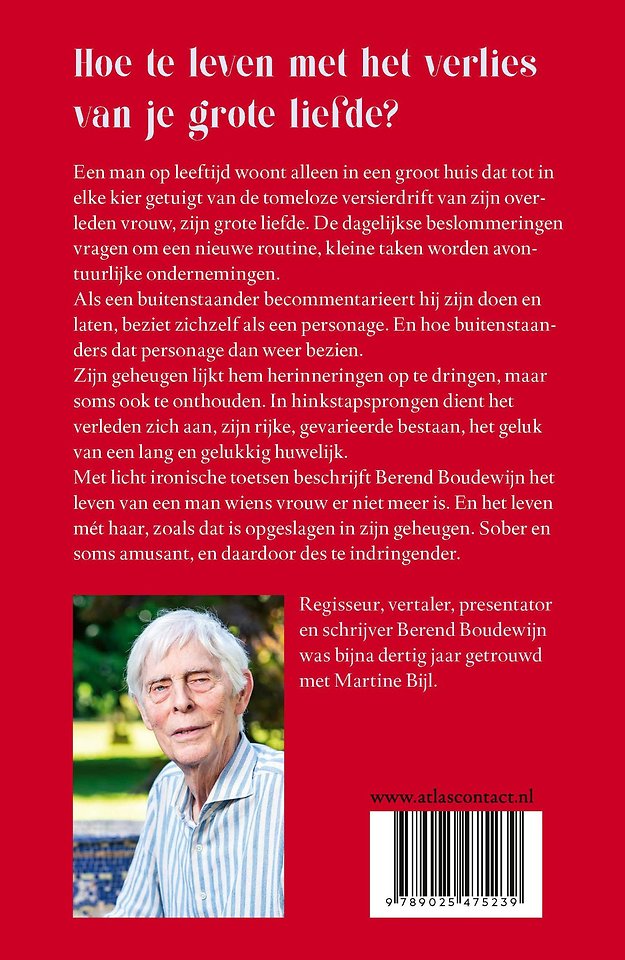 Met licht ironische toetsen beschrijft Berend Boudewijn het leven van een man wiens vrouw er niet meer is. En het leven mét haar, zoals dat is opgeslagen in zijn geheugen. Sober en soms amusant, en daardoor des te indringender.