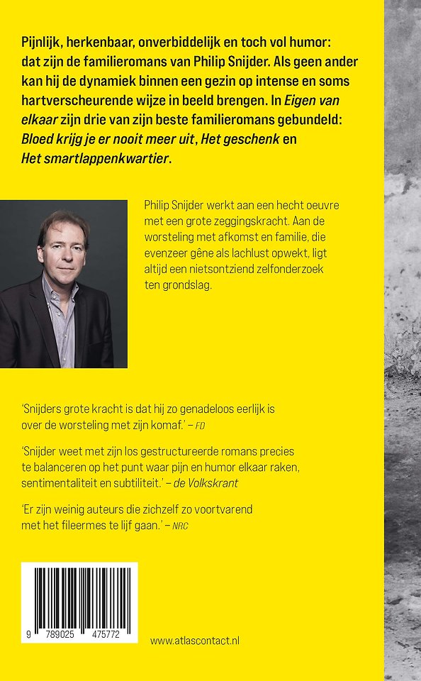 In Eigen van elkaar zijn drie van Snijders beste familieromans gebundeld: Bloed krijg je er nooit meer uit, Het geschenk en Het smartlappenkwartier.