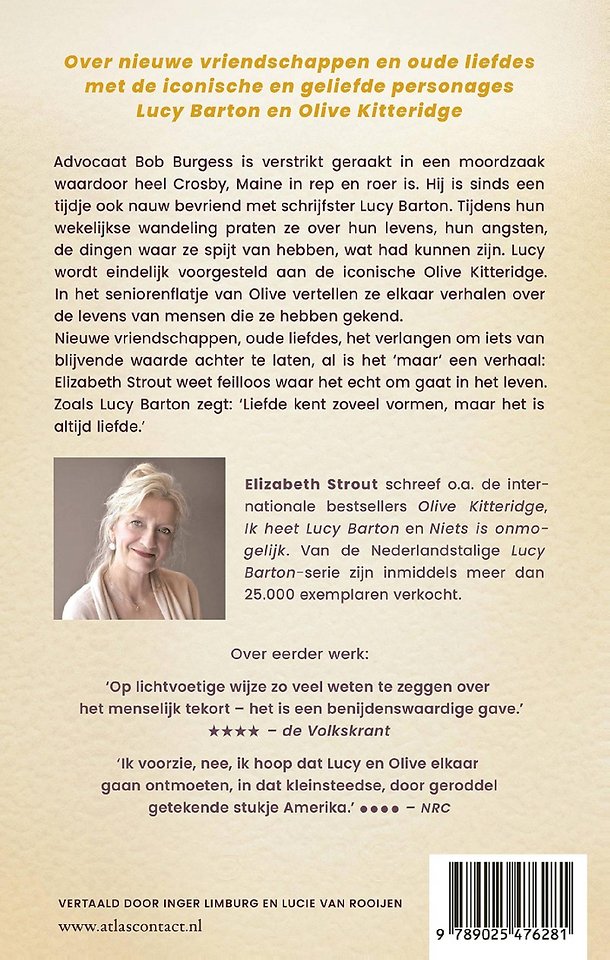 Nieuwe vriendschappen, oude liefdes, het verlangen om iets van blijvende waarde achter te laten, al is het maar een verhaal: Elizabeth Strout weet feilloos waar het echt om gaat in het leven. Zoals Lucy Barton zegt: Liefde kent zoveel vormen, maar het is altijd liefde.