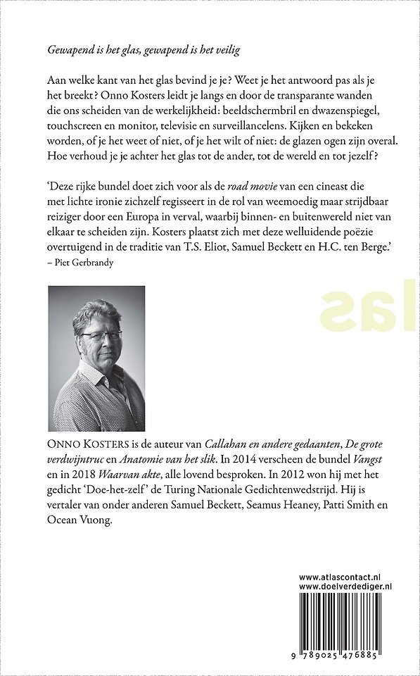 Aan welke kant van het glas bevind je je? Weet je het antwoord pas als je het breekt? Onno Kosters leidt je langs en door de transparante wanden die ons scheiden van de werkelijkheid: beeldschermbril en dwazenspiegel, touchscreen en monitor, televisie en surveillancelens. Kijken en bekeken worden, of je het weet of niet, of je het wilt of niet: de glazen ogen zijn overal. Hoe verhoud je je achter het glas tot de ander, tot de wereld en tot jezelf?