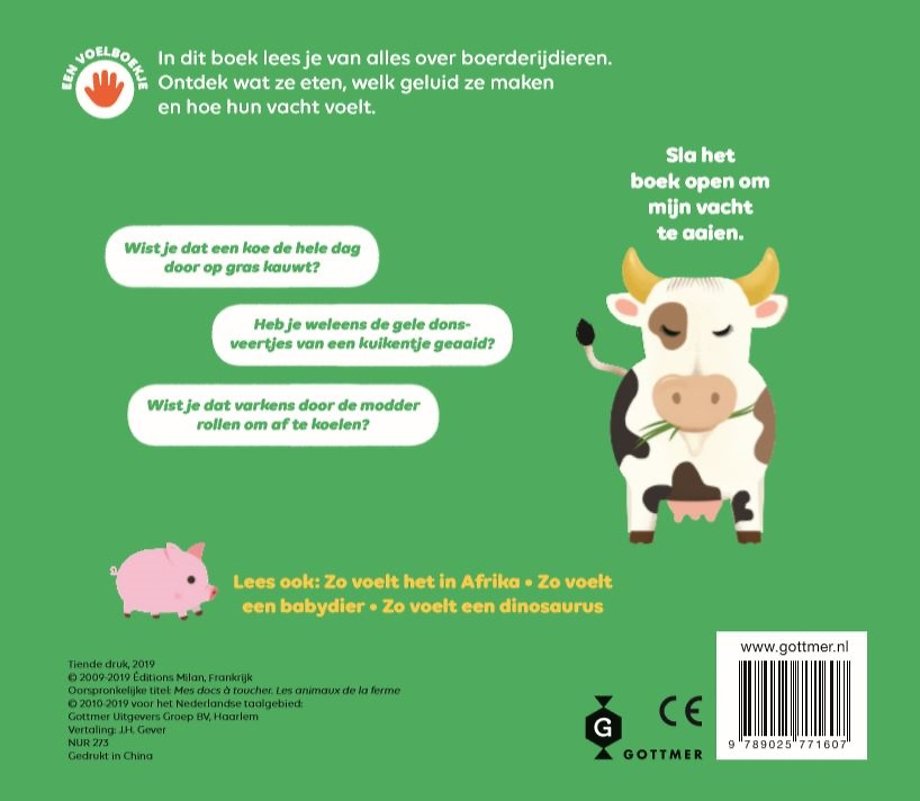 Het populaire kartonboekje met flappen en voelplekjes: 'Zo voelt het op de boerderij' in de leuke non-fictieserie heeft nu een frisse nieuwe vormgeving. De boekjes in de populaire non-fictieserie zijn ontwikkeld voor de allerkleinsten. Peuters kunnen alle dieren die in Zo voelt het op de boerderij staan gaan ontdekken. Op elke pagina is wel iets te vinden achter de flappen of te voelen op de vele voelplekjes, zoals de veertjes van een kuikentje. Daarnaast bevat het vrolijk geïllustreerde boekje behapbare stukjes informatie die begrijpelijk zijn voor kinderen vanaf ongeveer 2 jaar. De populairste deeltjes verschijnen nu in een nieuwe frisse vormgeving.