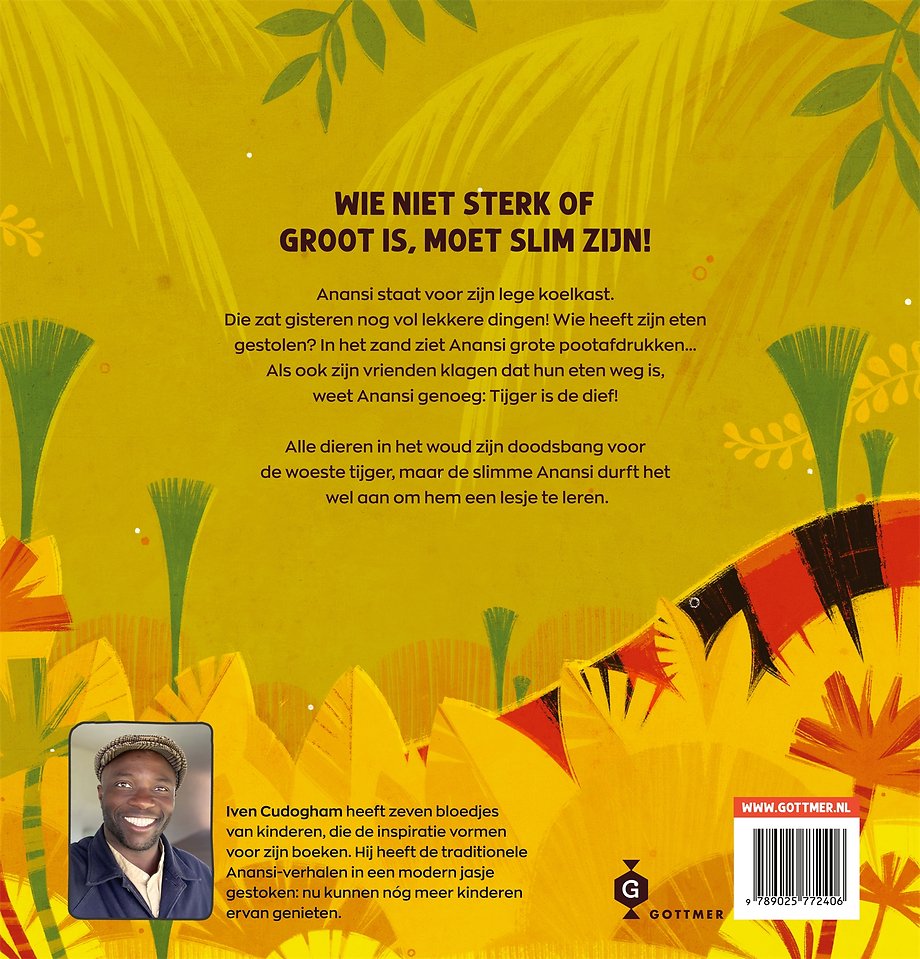 De vrolijke tekst van voormalig AT5-kinderpresentator Iven Cudogham, die net als Anansi vader is van 7 kinderen, neemt iedereen in voor de slimme maar ondeugende spin. De warme illustraties van Moldybyrd Studio maken van 'Anansi de spin en de gulzige tijger' een onmisbare titel.
