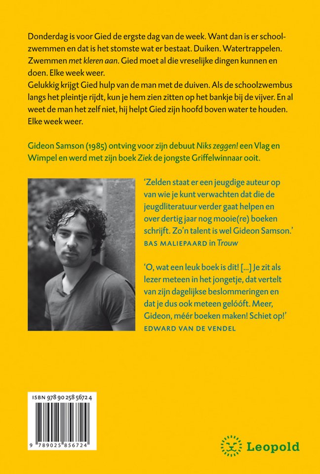 Gelukkig krijgt Gied hulp van de man met de duiven. Als de schoolzwembus langs het pleintje rijdt, kun je hem zien zitten op het bankje bij de vijver. En al weet de man het zelf niet, hij helpt Gied zijn hoofd boven water te houden. Elke week weer.
