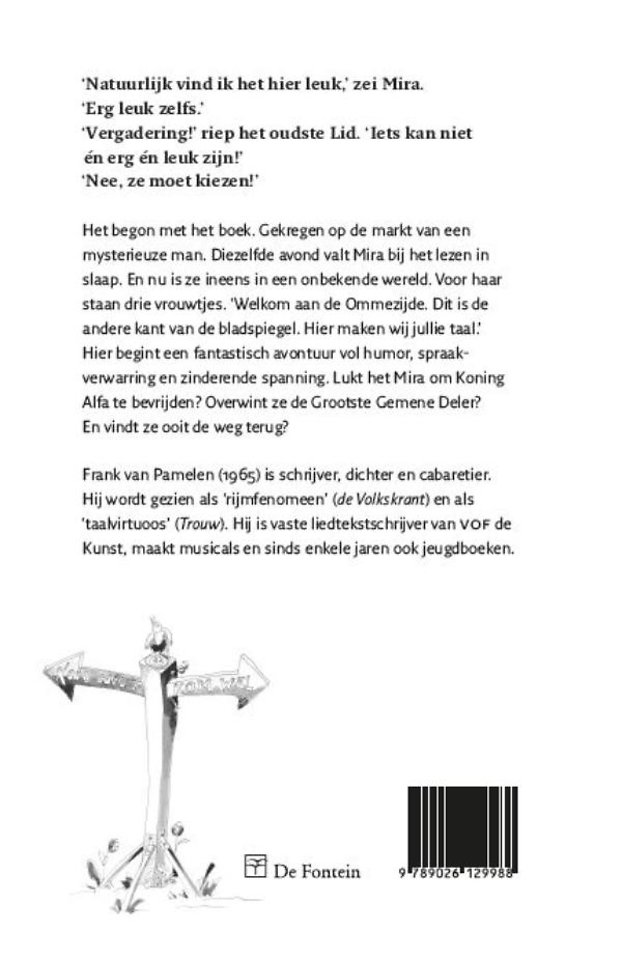 'Welkom aan de Ommezijde. Dit is de andere kant van de bladspiegel. Hier maken wij jullie taal.' Er begint een fantastisch avontuur vol humor en spraakverwarring, waarin de alfa's en de bèta's geconfronteerd worden met elkaars eigenaardigheden. Lukt het Mira om koning Alfa te bevrijden? Overwint ze de Grootste Gemene Deler? En vindt ze ooit de weg terug?