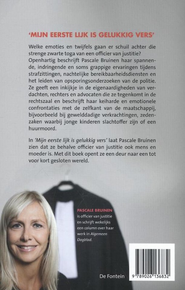 'Mijn eerste lijk is gelukkig vers' biedt een uniek kijkje achter de schermen van de misdaadbestrijding. Pascale Bruinen is officier van justitie en schrijft een wekelijkse column over haar werk in Algemeen Dagblad. Welke gevoelens, emoties en twijfels gaan er schuil achter die strenge zwarte toga van de officier van justitie? Met een open en eerlijke blik beschrijft Pascale Bruinen haar spannende, grappige en vaak indringende ervaringen tijdens strafzittingen, nachtelijke diensten en het leiden van opsporingsonderzoeken van de politie. In 'Mijn eerste lijk is gelukkig vers' laat zij zien dat ze als officier van justitie dan wel `één en ondeelbaar is maar dat ze als persoon en auteur juist de som van drie delen is: magistraat, mens en moeder. Met dit boek opent ze een deur naar een wereld die tot voor kort hermetisch gesloten bleef.