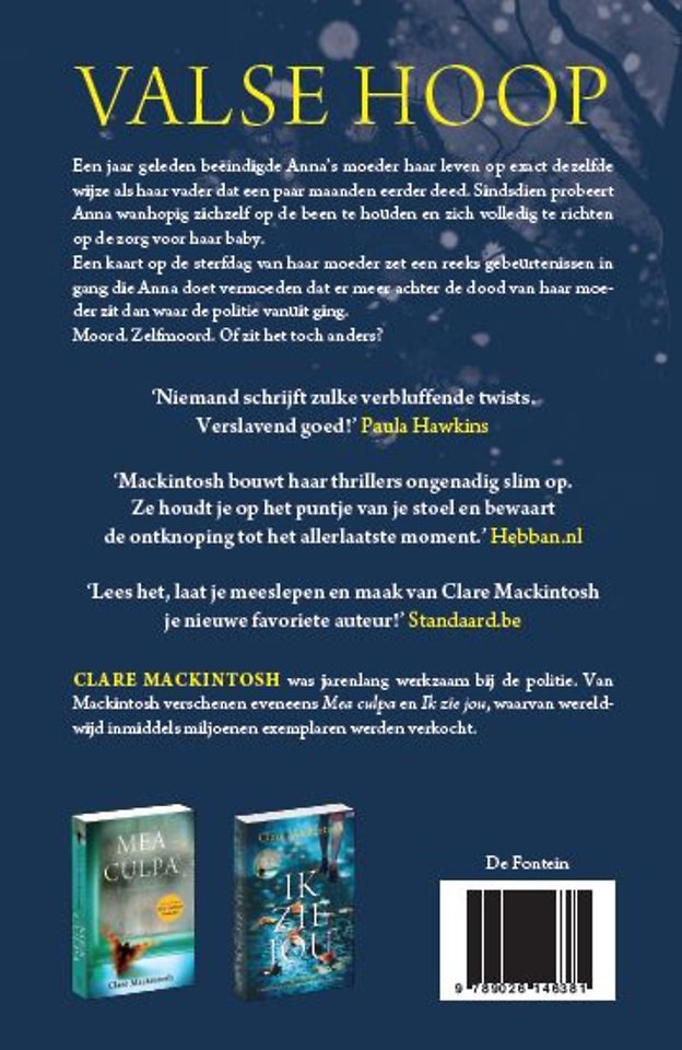 Clare Mackintosh is de auteur van psychologische thrillers als 'Mea culpa' en 'Ik zie jou'. 'Valse hoop' (Let Me Lie) is opnieuw een boek met verbijsterende twists. Een kaart op de sterfdag van haar moeder zet een reeks gebeurtenissen in gang die Anna doet vermoeden dat er meer achter de dood van haar moeder zit dan waar de politie vanuit ging…