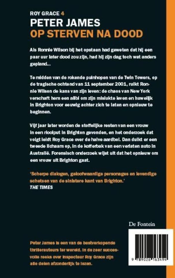 'Op sterven na dood'' is het vierde deel in de Roy Grace-serie van Peter James waarvan alle delen afzonderlijk te lezen zijn. 'Wie eenmaal aan een Roy Grace-thriller begint, is voor zijn omgeving onbereikbaar.'
