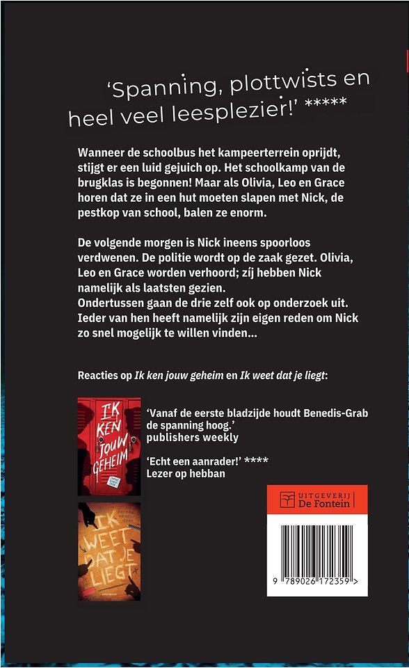 Olivia, Leo en Grace hebben weinig met elkaar gemeen, behalve dat ze een bloedhekel hebben aan Nicky, de pestkop van school. Ze balen dan ook als ze op schoolkamp met hem in een huisje worden ingedeeld. De volgende dag is Nicky spoorloos verdwenen en zíj zijn de laatsten die hem gezien hebben.