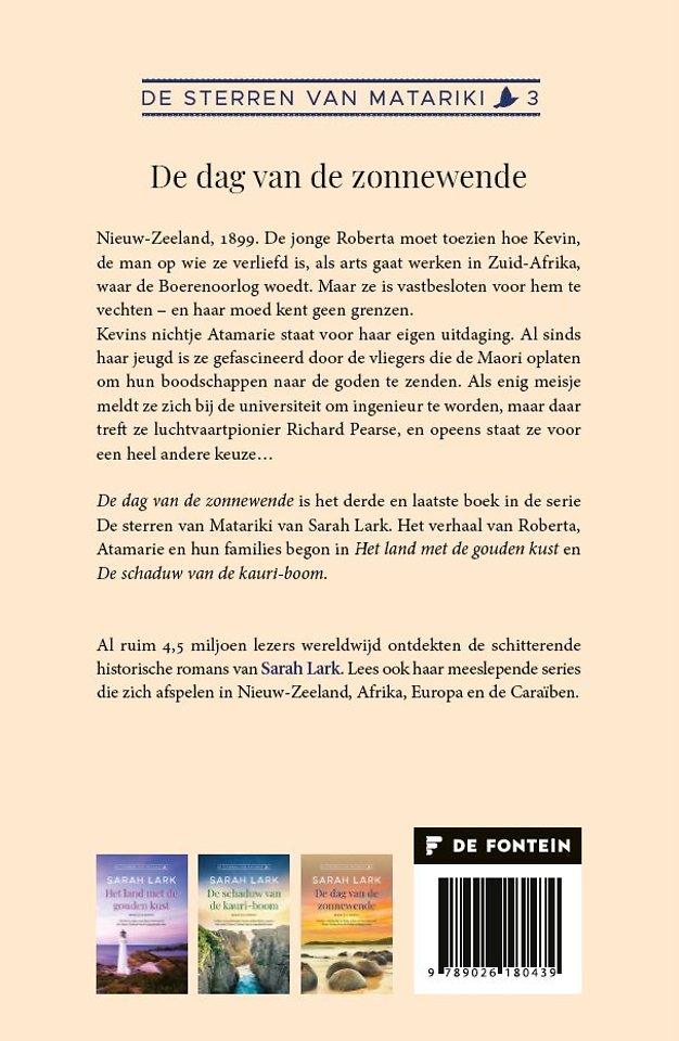 ‘De sterren van Matariki’ is de tweede serie van Sarah Lark die zich in het Nieuw-Zeeland van de negentiende eeuw afspeelt, en bestaat uit drie boeken: ‘Het land met de gouden kust’, ‘De schaduw van de kauri-boom’ en ‘De dag van de zonnewende’.