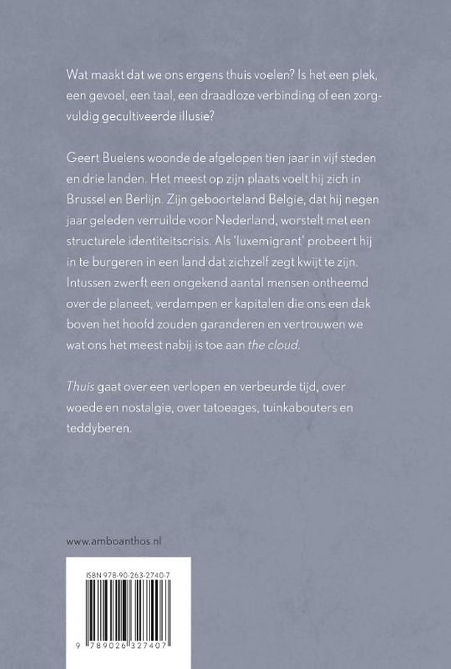 Thuis is de nieuwe poëziebundel van Geert Buelens. In deze gedichten stelt Buelens de vraag wat maakt dat we ons ergens thuis voelen. Is het een plek, een gevoel, een taal, een draadloze verbinding of een zorgvuldig gecultiveerde illusie? Thuis gaat over een verlopen en verbeurde tijd, over woede en nostalgie, over tatoeages, tuinkabouters en teddyberen.