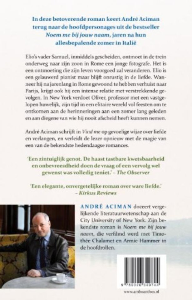 Vind me van André Aciman is het langverwachte vervolg op zijn bestseller Noem me bij jouw naam. In Vind me keert André Aciman terug naar de hoofdpersonen van zijn wereldwijde bestseller, vijftien jaar na die allesbepalende zomer.