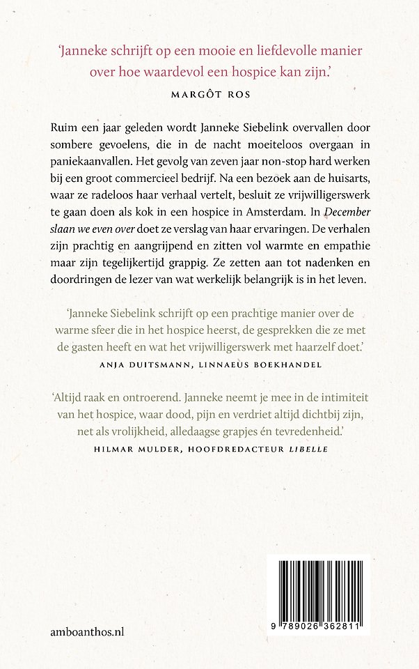 Ruim een jaar geleden wordt Janneke Siebelink overvallen door sombere gevoelens, die in de nacht moeiteloos overgaan in paniekaanvallen. Het gevolg van zeven jaar non-stop hard werken bij een groot commercieel bedrijf. Na een bezoek aan de huisarts, waar ze radeloos haar verhaal vertelt, besluit ze vrijwilligerswerk te gaan doen als kok in een hospice in Amsterdam. In December slaan we even over doet ze verslag van haar ervaringen. De verhalen zijn prachtig, aangrijpend en vol warmte en empathie maar tegelijkertijd grappig. December slaan we even over van Janneke Siebelink zet aan tot nadenken en doordringt de lezer van wat werkelijk belangrijk is in het leven.