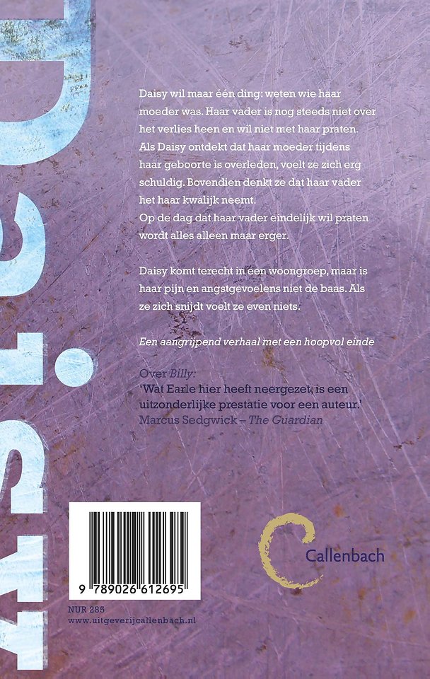 Daisy wil het liefst even niets meer voelen. De veertienjarige Daisy wil eigenlijk maar één ding: weten wie haar moeder was. Haar vader rouwt nog steeds om zijn vrouw en wil niet met Daisy praten. Dan ontdekt Daisy dat haar moeder is overleden op de dag dat zij geboren werd. Ze voelt zich hier schuldig over en denkt dat haar vader het haar kwalijk neemt. Ten einde raad gaat ze bij haar vader weg. Daisy komt in een woongroep terecht. Maar de afstand helpt niet om de pijn te verzachten. Het enige wat werkt, is zichzelf snijden. Dan voelt ze even niets. Phil Earle heeft na zijn studie jarenlang ervaring opgedaan als jongerenwerker in Londen. De levensverhalen die hij daar hoorde inspireerden hem om jaren later te beginnen met schrijven. Hij debuteerde met `Billy , dat lovend werd ontvangen. Nu is hij terug met `Daisy .