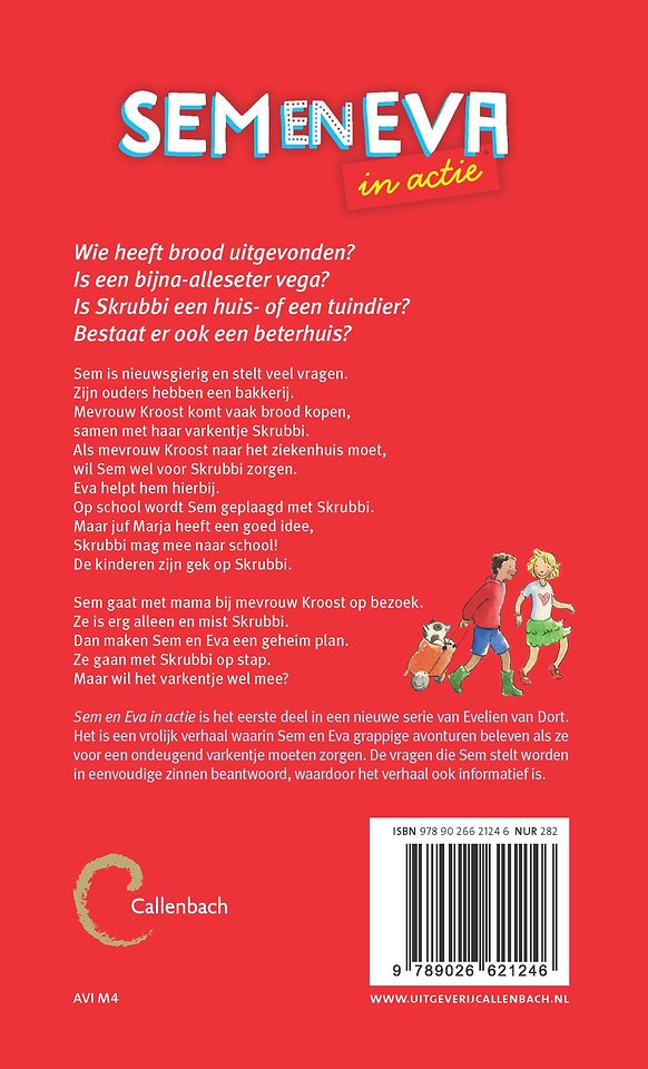 ‘Sem en Eva in actie’ van Evelien van Dort is het eerste deel in een nieuwe serie op AVI-4/M4-niveau. In een aantal hoofdstukken is er een aparte pagina met korte uitleg op AVI-niveau over een woord of begrip uit het hoofdstuk. Bijvoorbeeld uitleg over het verzorgen van een huisdier, een weetje over de bakkerij of informatie over ouder worden. Hierdoor zijn de boeken over Sem en Eva zowel leuk als leerzaam.