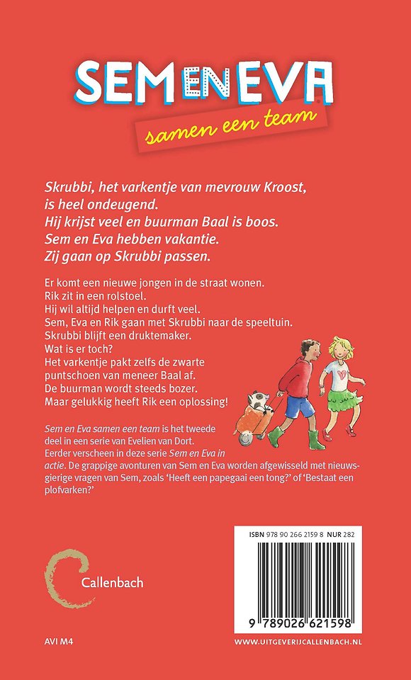 ‘Sem en Eva samen een team’ van Evelien van Dort is een boek op AVI 4 niveau. Eerder verscheen in deze serie ‘Sem en Eva in actie’. Rik komt bij Sem en Eva in de straat wonen, hij zit in een rolstoel. Sem, Eva en Rik schrijven zich als team in voor het Zomerspel. Het ondeugende varkentje Skrubbi is van de partij en zorgt voor grappige voorvallen. Een ontroerend verhaal over vriendschap, leven met een handicap en doorzetten. Van Dort is onder andere bekend van haar boekenserie over het paard Funny.