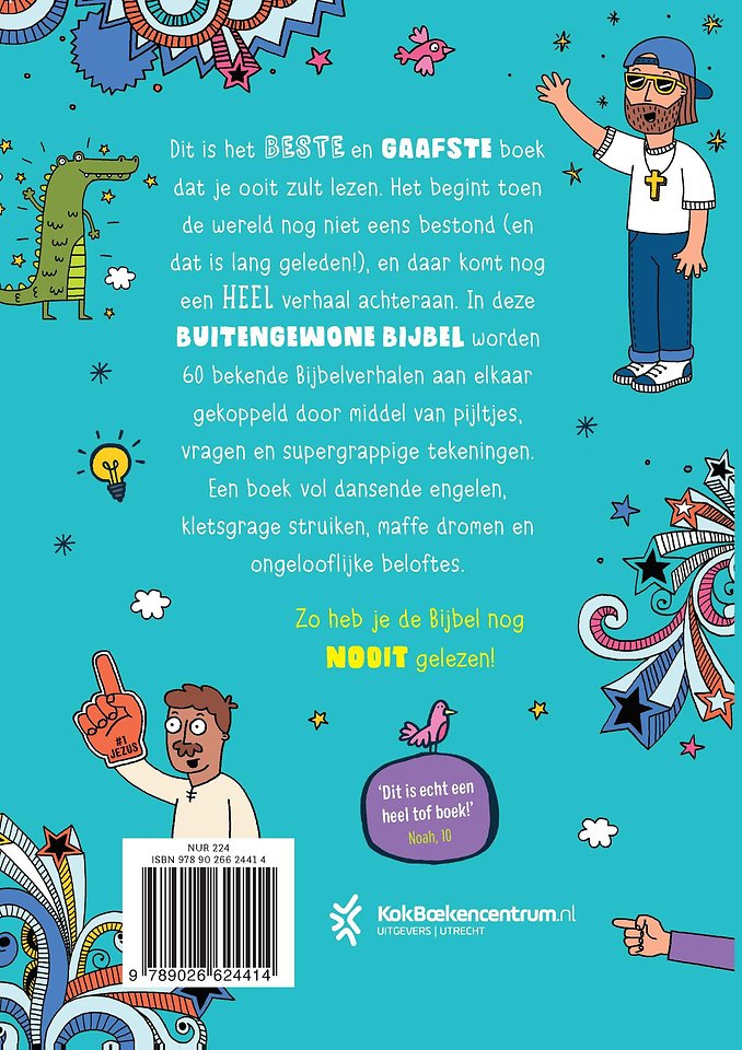 De Bijbel is het beste en gaafste boek dat je ooit zult lezen. Het begint toen de wereld nog niet eens bestond (en dat is lang geleden!), en daar komt nog een heel verhaal achteraan. In deze ‘Buitengewone Bijbel’ worden zestig verhalen uit de Bijbel aan elkaar verbonden door middel van pijltjes, vragen en supergrappige tekeningen. Zo heb je de Bijbel nog nooit gelezen!