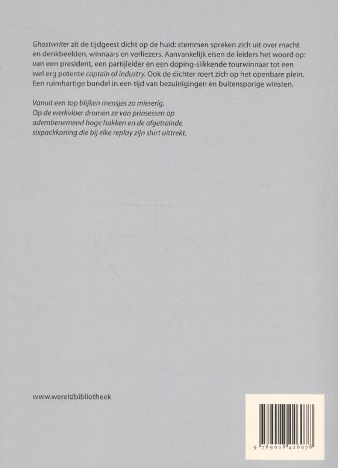GHOSTWRITER zit de tijdgeest dicht op de huid. Stemmen spreken zich uit over macht en denkbeelden, over winnaars en verliezers. Allerhande leiders nemen het woord: van de Amerikaanse president, een wapenhandelaar en een doping-slikkende wielrenner, tot een ziekenhuisdirecteur. Op het openbare plein blijft ook de dichter niet buiten beeld.
