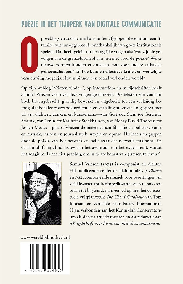 In de laatste tien jaar is op weblogs en sociale media een literaire cultuur opgebloeid ‘van onderop’, vanuit de grenzeloze mogelijkheden van het internet, zonder bemiddeling van grote institutionele spelers. Tot wat voor soort poëzie heeft dit geleid? En kan er nog vernieuwing zijn als er geen grenzen aan snelheid en toegankelijkheid zijn? Aan de hand van werk van auteurs als Jeroen Mettes, Gertrude Stein, Arjen Duinker, Thoreau, Goldsmith en Scalapino onderzoekt Samuel Vriezen deze vragen. Hij situeert ze in een bredere wereld van muziek, beeldende kunst en politiek, en signaleert de punten waarop het alomvattende netwerk stukloopt. Samuel Vriezen heeft veel gepubliceerd over dit onderwerp – op zijn weblog ‘Vriezen vindt’, op internetfora, op sociale media en in tijdschriften. Hij heeft zijn teksten grondig bewerkt en uitgebreid voor dit boek. Een bewuste keuze, want er is geen beter hulpmiddel voor een genuanceerd betoog dan een boek, geen indringender dialoogbevorderaar tussen schrijver en lezer dan een boek. Het internet blijft, maar het boek beklijft.