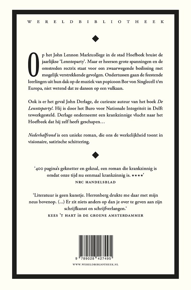 Nederhalfrond is het eerste deel van een buitengewoon ambitieuze roman, Door het Oog van de Cycloon. De roman speelt zich af in een parallelle Nederlandse werkelijkheid, die een verrassend en vaak verbijsterend licht werpt op de onze. Het proza beukt en zingt. De zinnelijke rijkdom ervan biedt een overweldigende leeservaring.