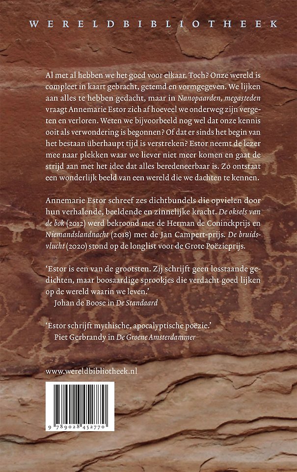 Al met al hebben we het goed voor elkaar. Toch? Onze wereld is compleet in kaart gebracht, getemd en vormgegeven. We lijken aan alles te hebben gedacht, maar in Nanopaarden megasteden vraagt Annemarie Estor zich af hoeveel we onderweg zijn vergeten en verloren. Weten we bijvoorbeeld nog wel dat onze kennis ooit als verwondering is begonnen? Of dat er sinds het begin van het bestaan überhaupt tijd is verstreken? Estor neemt de lezer mee naar plekken waar we liever niet meer komen en gaat de strijd aan met het idee dat alles beredeneerbaar is. Zo ontstaat een wonderlijk beeld van een wereld die we dachten te kennen.