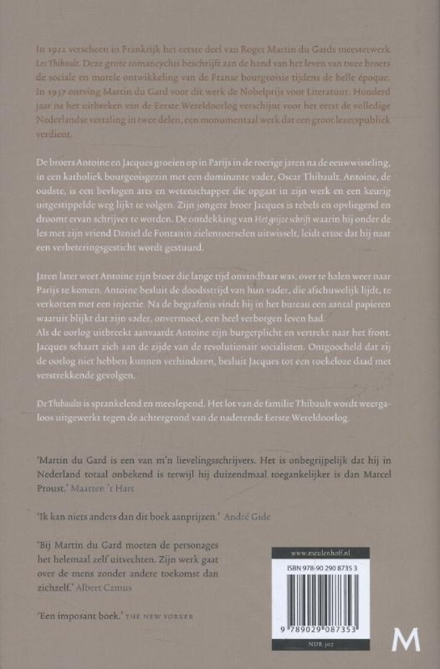 De Thibaults is sprankelend en meeslepend. Het lot van de familie Thibault wordt weergaloos uitgewerkt tegen de achtergrond van de naderende Eerste Wereldoorlog. In 1937 ontving Martin du Gard voor dit werk de Nobelprijs voor de Literatuur.