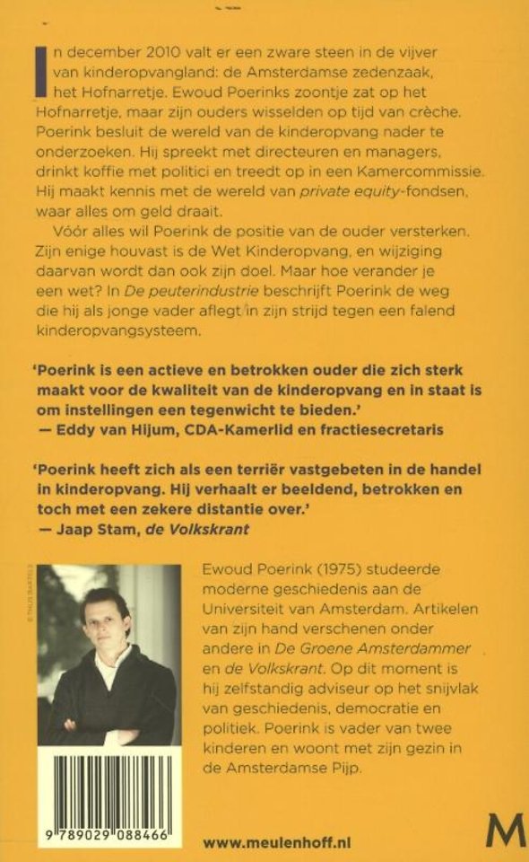 In december 2010 valt er een zware steen in de vijver van kinderopvangland: de Amsterdamse zedenzaak, het Hofnarretje. Ewoud Poerinks zoontje zat op het Hofnarretje, maar zijn ouders wisselden van crèche, nog voor het schandaal bekend werd. Ze voelden zich er niet op hun gemak en konden met hun kind terecht bij de crèche die altijd al hun voorkeur had en die ooit als beste te boek stond. Maar bij nader inzien blijkt ook daar van alles mis te zijn.Poerink besluit de wereld van de kinderopvang verder te onderzoeken. Hij spreekt met directeuren en managers, drinkt koffie met politici en geeft raad aan een Kamercommissie. Hij maakt kennis met de wereld van private equityfondsen waar alles om geld draait. Vóór alles wil Poerink de positie van de ouder versterken. Het enige houvast is de Wet Kinderopvang, en dat wordt dan ook zijn doel. Maar hoe verander je een wet?In De peuterindustrie beschrijft Poerink de weg die hij als jonge vader aflegt in zijn strijd tegen een - in zijn ogen - falend kinderopvangsysteem.