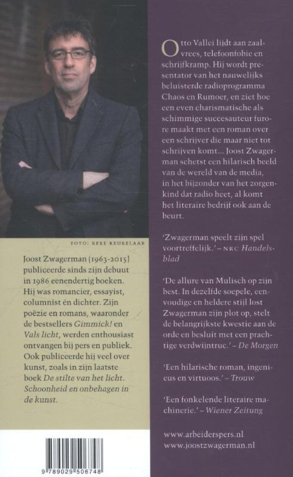 Otto Vallei lijdt aan zaalvrees, telefoonfobie en schrijfkramp. Hij wordt presentator van het nauwelijks beluisterde radioprogramma Chaos en Rumoer, en ziet hoe een even charismatische als schimmige succesauteur furore maakt met een roman over een schrijver die maar niet tot schrijven komt... Joost Zwagerman schetst een hilarisch beeld van de wereld van de media, in het bijzonder van het zorgenkind dat radio heet, al komt het literaire bedrijf ook aan de beurt.