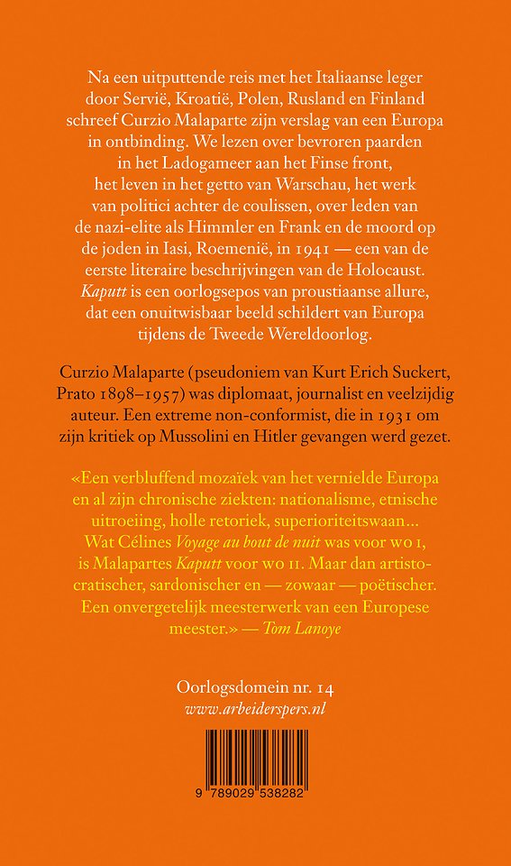 Na een uitputtende reis met het Italiaanse leger door Servië, Kroatië, Polen, Rusland en Finland schreef Curzio Malaparte zijn verslag van een Europa in ontbinding. We lezen over bevroren paarden in het Ladogameer aan het Finse front, het leven in het getto van Warschau, het werk van politici achter de coulissen, over leden van de nazi-elite en over de grootscheepse moord op de Joden in Iasi, Roemenië, in 1941 – een van de eerste literaire beschrijvingen van de Holocaust. Kaputt is een oorlogsepos van proustiaanse allure dat een verbluffend beeld schildert van Europa tijdens de Tweede Wereldoorlog.
