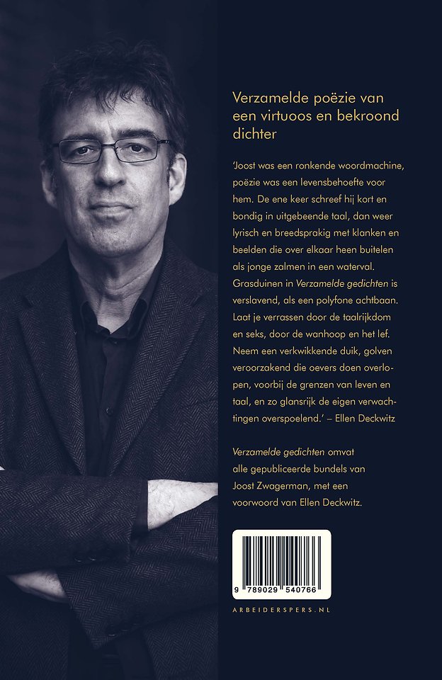 Joost Zwagerman (1963-2015) was romancier, essayist, columnist, maar in de eerste plaats dichter. Verzamelde gedichten omvat al zijn gepubliceerde bundels in één band. Langs de doofpot, De ziekte van jij en Bekentenissen van een pseudomaan benadrukken de vele maskerades en gedaantes van de jonge dichter Zwagerman. Deze bundels fungeerden als poëtisch voorland voor het bejubelde en bekroonde Roeshoofd hemelt. In Voor alles lijkt de levensangst uitzichtloos en wordt de liefde op verkwikkend originele manier bezongen. Zijn laatst voltooide, postuum uitgegeven bundel Wakend over God beschrijft de geloofsstrijd van een naamloos blijvende ik.