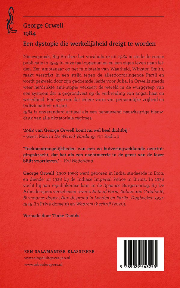 Nieuwspraak, Big Brother: het vocabulaire uit 1984 is sinds de eerste publicatie in 1949 in onze taal opgenomen en een eigen leven gaan leiden. Een ambtenaar op het ministerie van Waarheid, Winston Smith, raakt verstrikt in een strijd tegen de alles doordringende Partij en wordt gekweld door zijn gedoemde liefde voor Julia. In Orwells steeds weer herdrukte anti-utopie verkeert de wereld in de wurggreep van een systeem dat is gegrondvest op de verbreiding van angst, haat en wreedheid en dat iedere vorm van persoonlijke vrijheid en individualiteit uitsluit.