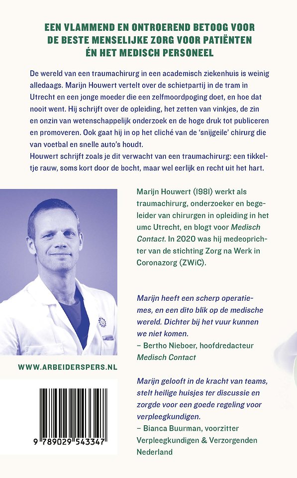 De wereld van een traumachirurg in een academisch ziekenhuis is weinig alledaags. Marijn Houwert vertelt over de schietpartij in de tram in Utrecht en een jonge moeder die een zelfmoordpoging doet, en hoe dat nooit went. Hij schrijft over de opleiding, het zetten van vinkjes, de zin en onzin van wetenschappelijk onderzoek en de hoge druk tot publiceren en promoveren. Ook gaat hij in op het cliché van de ‘snijgeile’ chirurg die van voetbal en snelle auto’s houdt.