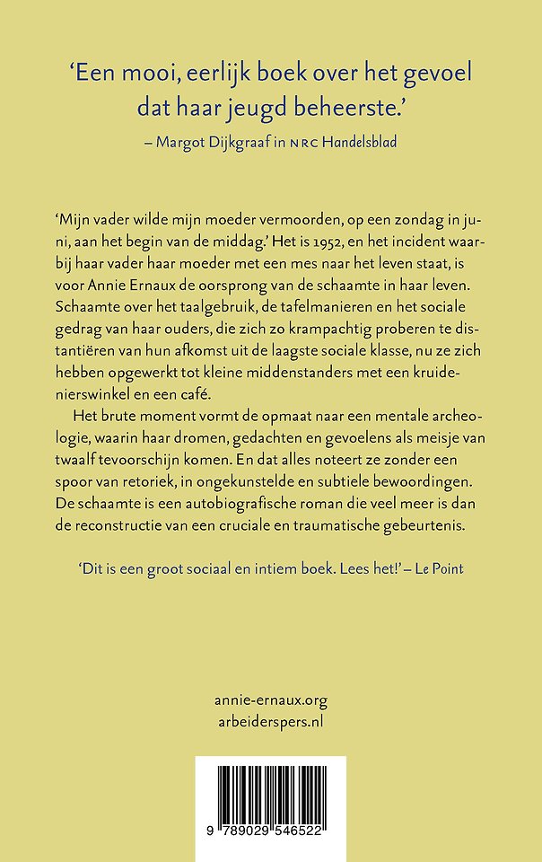 ‘Mijn vader wilde mijn moeder vermoorden, op een zondag in juni, aan het begin van de middag.’ Het is 1952, en het incident waarbij haar vader haar moeder met een mes naar het leven staat, is voor Annie Ernaux de oorsprong van de schaamte in haar leven. Schaamte over het taalgebruik, de tafelmanieren en het sociale gedrag van haar ouders, die zich zo krampachtig proberen te distantiëren van hun afkomst uit de laagste sociale klasse, nu ze zich hebben opgewerkt tot kleine middenstanders met een kruidenierswinkel en een café.