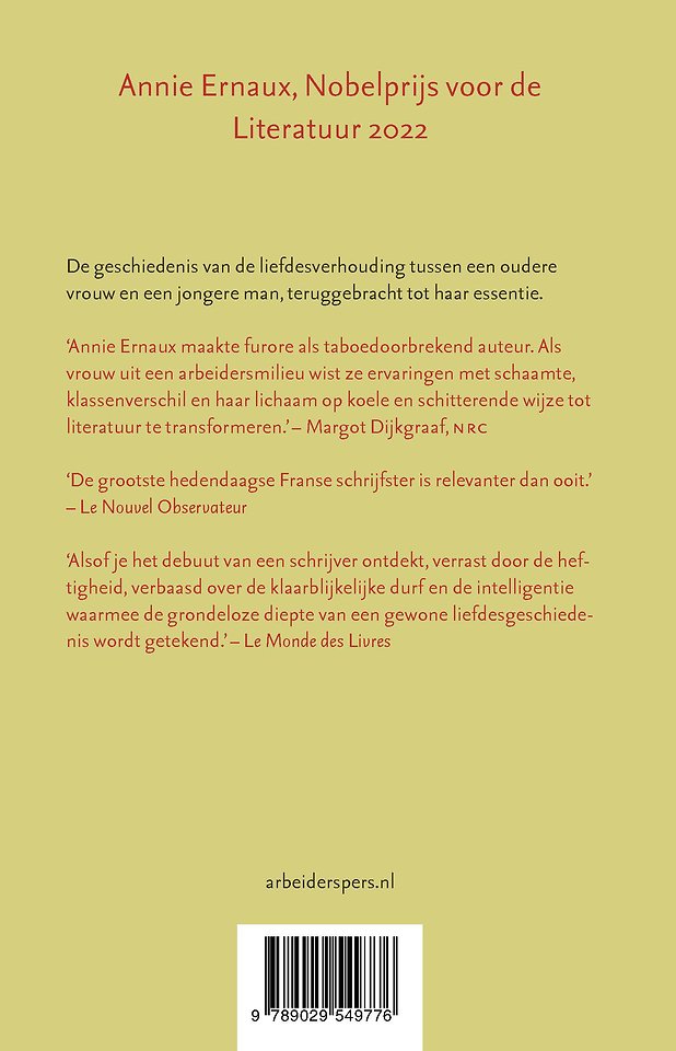 In De jongeman vertelt Annie Ernaux summier (en in de eerste persoon enkelvoud) over een voorbije liefdesrelatie met een dertig jaar jongere man. Zijzelf is dan al bijna zestig. In compacte, intense, uiterst efficiënte zinnen zoekt ze naar een antwoord op de vraag wat er in die relatie op het spel stond. Voor haarzelf was dat herleven: zich opnieuw jong voelen, maar ook ingewijd worden in haar eigen verleden. De jongeman is een sleutel tot het lezen van Ernaux’ werk. Al haar thema’s komen in deze miniatuur samen: tijd, herinnering, liefde, maatschappij, en hoe haar leven steevast in het teken staat van het nog te schrijven boek.