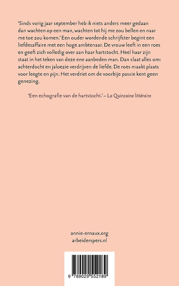 ‘Sinds vorig jaar september heb ik niets anders meer gedaan dan wachten op een man, wachten tot hij me zou bellen en naar me toe zou komen.’ Een ouder wordende schrijfster begint een liefdesaffaire met een hoge ambtenaar. De vrouw leeft in een roes en geeft zich volledig over aan haar hartstocht. Heel haar zijn staat in het teken van deze ene aanbeden man. Dan slaat alles om: achterdocht en jaloezie verdrijven de liefde. De roes maakt plaats voor leegte en pijn. Het verdriet om de voorbije passie kent geen genezing.