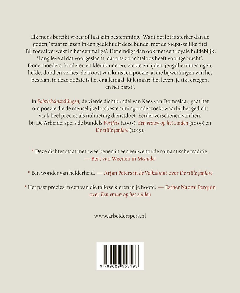 In Fabrieksinstellingen, de vierde dichtbundel van Kees van Domselaar, gaat het om poëzie die de menselijke lotsbestemming onderzoekt waarbij het gedicht vaak heel precies als nulmeting dienstdoet. Eerder verschenen van hem bij De Arbeiderspers de bundels Postfris (2005), Een vrouw op het zuiden (2009) en De stille fanfare (2019).
