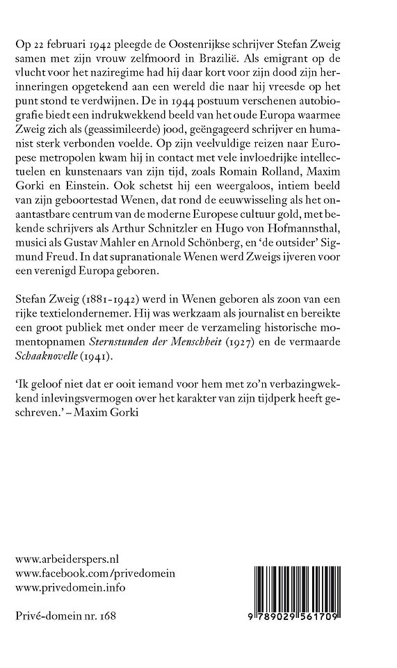 Op 22 februari 1942 pleegde de Oostenrijkse schrijver Stefan Zweig samen met zijn vrouw zelfmoord in Brazilië. Als emigrant op de vlucht voor het naziregime had hij daar kort voor zijn dood zijn herinneringen opgetekend aan een wereld die naar hij vreesde op het punt stond te verdwijnen. De in 1944 postuum verschenen autobiografie biedt een indrukwekkend beeld van het oude Europa waarmee Zweig zich als (geassimileerde) jood, geëngageerd schrijver en humanist sterk verbonden voelde.