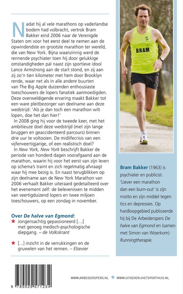 Nadat hij al vele marathons op vaderlandse bodem had volbracht, vertrok Bram Bakker eind 2006 naar de Verenigde Staten om voor het eerst deel te nemen aan de opwindendste en grootste marathon ter wereld, die van New York. Bijna waanzinnig werd de rennende psychiater toen hij door gelukkige omstandigheden pal naast zijn sportieve idool Lance Armstrong aan de start stond, en zij aan zij zo’n tien kilometer met hem door Brooklyn rende, waar net als in alle andere buurten van The Big Apple duizenden enthousiaste toeschouwers de lopers fanatiek aanmoedigden. Deze overweldigende ervaring maakt Bakker tot een ware pleitbezorger van deelname aan deze wedstrijd: 'Als je dan toch een marathon wilt lopen, doe het dan hier!'