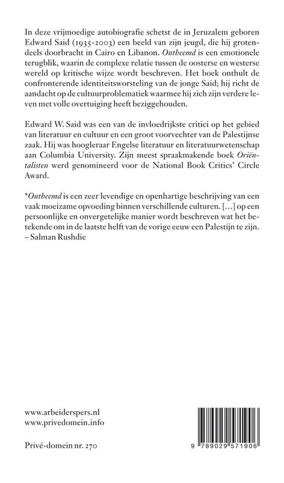 In deze vrijmoedige autobiografie schetst de in Jeruzalem geboren Edward Said (1935-2003) een beeld van zijn jeugd, die hij grotendeels doorbracht in Cairo en Libanon. Ontheemd is een emotionele terugblik, waarin de complexe relatie tussen de oosterse en westerse wereld op kritische wijze wordt beschreven. Het boek onthult de confronterende identiteitsworsteling van de jonge Said; hij richt de aandacht op de cultuurproblematiek waarmee hij zich zijn verdere leven met volle overtuiging heeft beziggehouden.