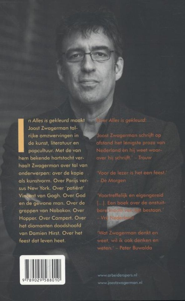 In Alles is gekleurd maakt Joost Zwagerman talrijke omzwervingen in de kunst, literatuur en popcultuur. Met de van hem bekende hartstocht verhaalt Zwagerman over tal van onderwerpen: over de kopie als kunstvorm. Over Parijs versus New York. Over `patiënt Vincent van Gogh. Over God en de gewone man. Over de grappen van Nabokov. Over Hopper. Over Campert. Over het diamanten doodshoofd van Damien Hirst. Over het feest dat leven heet.