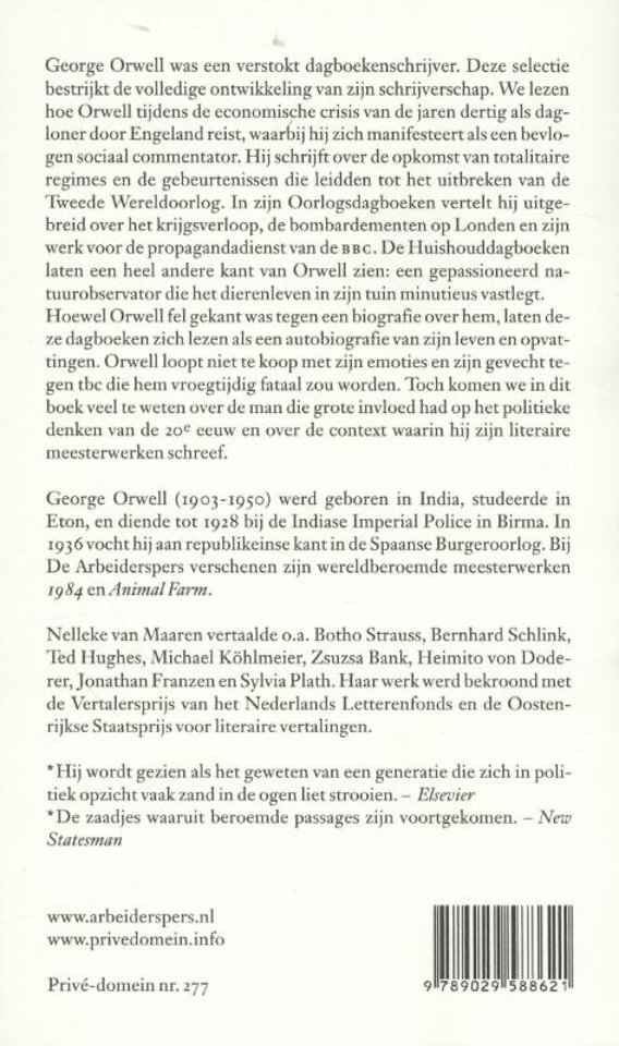 George Orwell was een verstokt dagboekenschrijver. Deze selectie bestrijkt de volledige ontwikkeling van zijn schrijverschap. We lezen hoe Orwell tijdens de economische crisis van de jaren dertig als dagloner door Engeland reist, waarbij hij zich manifesteert als een bevlogen sociaal commentator. Hij schrijft over de opkomst van totalitaire regimes en de gebeurtenissen die leidden tot het uitbreken van de Tweede Wereldoorlog. In zijn Oorlogsdagboeken vertelt hij uitgebreid over het krijgsverloop, de bombardementen op Londen en zijn werk voor de propagandadienst van de BBC. De Huishouddagboeken laten een heel andere kant van Orwell zien: een gepassioneerd natuurobservator die het dierenleven in zijn tuin minutieus vastlegt.