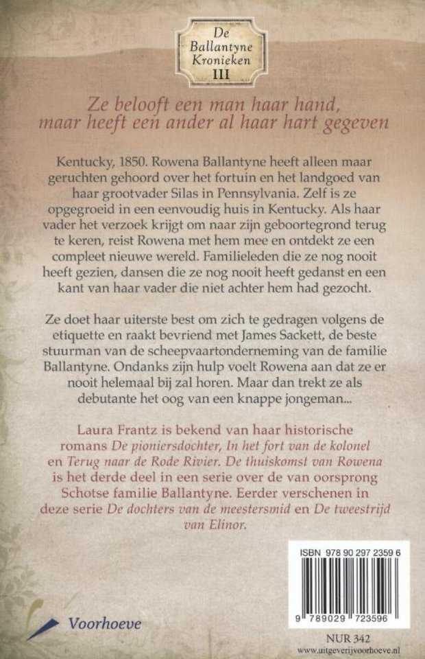 In het romantische boek 'De thuiskomst van Rowena' van Laura Frantz belooft een jonge vrouw een knappe man haar hand, terwijl ze een ander al haar hart heeft gegeven... Kentucky, 1950. Als de vader van Rowena Ballantyne het verzoek krijgt om terug te keren naar Pittsburgh, ontdekt Rowena een fascinerende wereld vol familieleden die ze nog nooit heeft ontmoet. Ze doet haar best om zich te gedragen volgens de strenge etiquette. Maar ondanks de hulp van James Sackett, de beste stuurman van de scheepvaartonderneming van de familie Ballantyne, denkt Rowena dat ze er nooit helemaal bij zal horen. Totdat ze als debutante het oog trekt van een knappe jongeman... "De thuiskomst van Rowena" is het derde deel in Laura Frantz' serie 'De Ballantyne Kronieken' over de van oorsprong Schotse familie Ballantyne.
