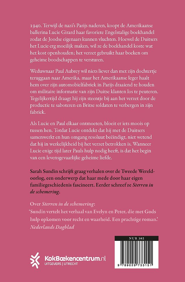 In ‘De boekhandel van het verzet’ van Sarah Sundin neemt de Amerikaanse ballerina Lucie haar favoriete Engelstalige boekhandel over, zodat de Joodse eigenaren kunnen ontsnappen. Ze helpt het verzet door geheime boodschappen tussen de bladzijden van de boeken te verstoppen.